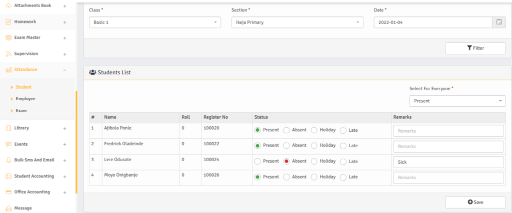 How to mark Student AttendanceSuper AdminJanuary 9, 2022Operational ManualClick on Attendance MenuClick on StudentSelect ClassSelect SectionSelect DateClick FilterMark by selecting the status of the studentEnter Remarks (Optional)Click Save