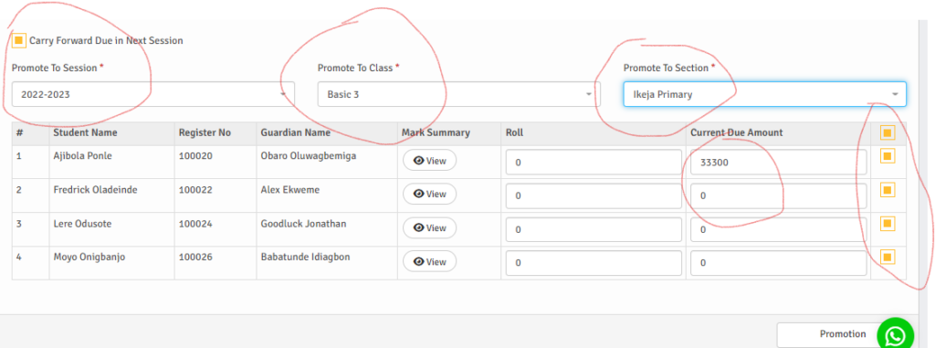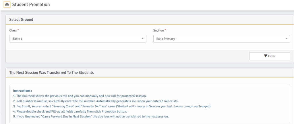 • Select Class and Section (Where the Student(s) is at the moment before promotion